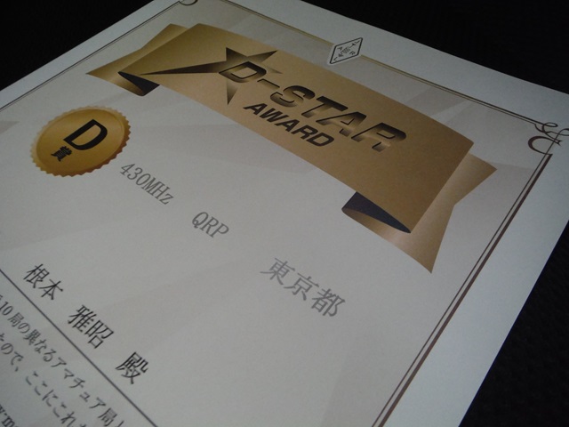 一般社団法人日本アマチュア無線連盟(JARL)の D-STARアワードD賞が届きました。