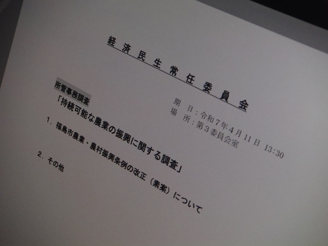 経済民生常任委員会では現在、持続可能な農業の振興について調査を進めており、福島市農業・農村振興条例の改正に向けて、素案検討の段階に入っております。