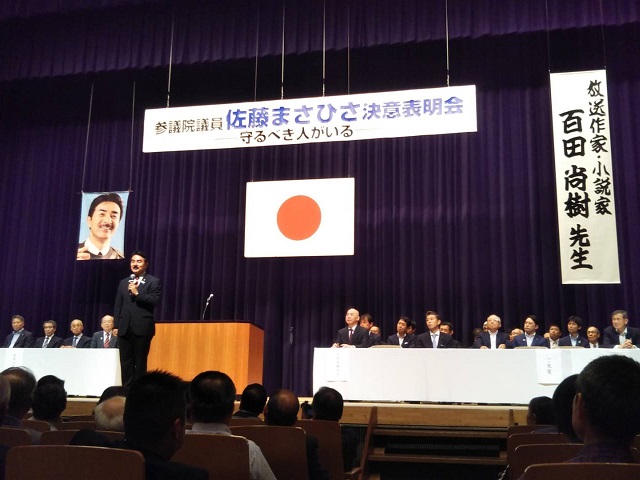 佐藤まさひさ外務副大臣・参議院議員の決意表明会に参加しました。 百田尚樹氏や亀岡偉民衆議院文部科学委員長をはじめ、多くのご来賓が参加する中、盛大に開催されました。