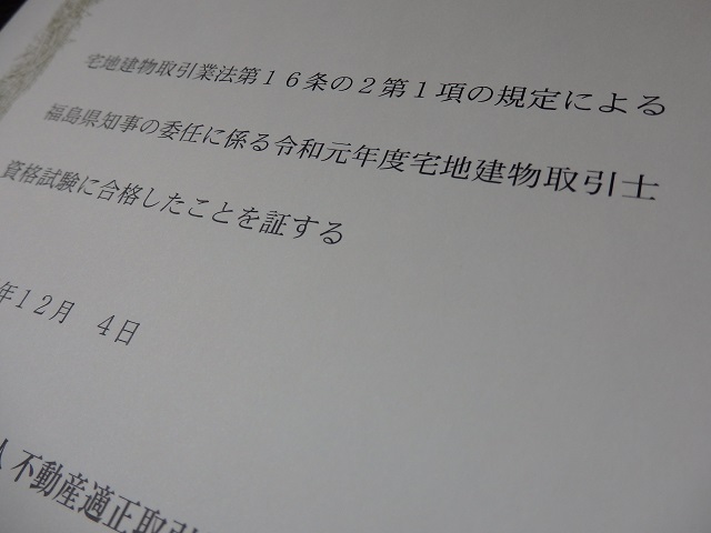 宅地建物取引士(宅建士)資格試験の合格証書が届きました!