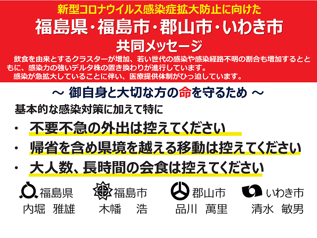 福島県・福島市・郡山市・いわき市より、新型コロナウイルス感染症拡大防止に向けた共同メッセージが発出されました。