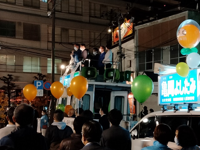 福島市のさんかく広場で行われた、亀岡よしたみ衆議院議員候補の打ち上げ式に参加しました。第49回衆議院議員総選挙の必勝に向けて、多くの方々が集まりました。第49回衆議院議員総選挙の投票日は、10月31日です。