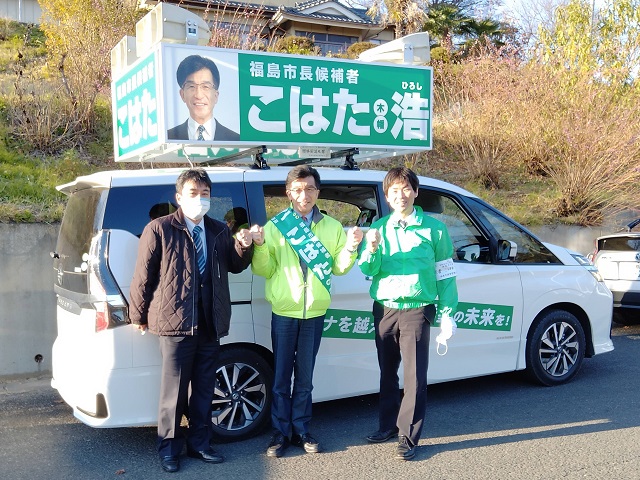 こはた浩福島市長候補の遊説の先導車に乗り、福島市内の遊説に同行しました。福島市長選は現職と新人の一騎打ちですが、福島市議会議員31/35名が、現職こはた浩福島市長候補を応援しております。