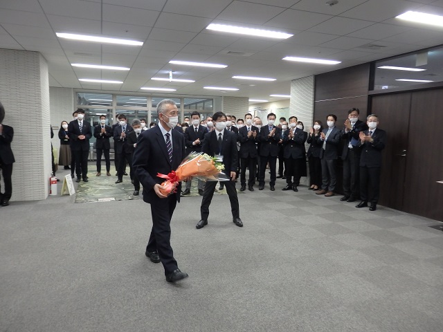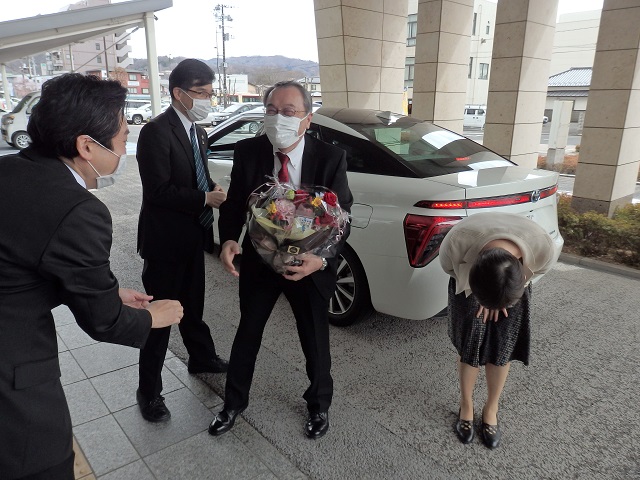 紺野喜代志副市長、八島洋一水道事業管理者及び井上安子代表監査委員が任期満了に伴い退任されました。長年にわたり福島市政発展のために尽力頂き、感謝の意を込めて花束が贈呈されました。
