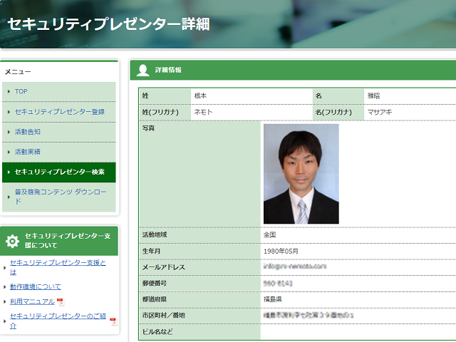 セキュリティプレゼンターに登録しました。セキュリティプレゼンターとは、全国の中小企業等における情報セキュリティ対策水準の向上を目的に情報セキュリティの普及啓発を行う人材で、独立行政法人情報処理推進機構(IPA)が推進しています。具体的には、IPAのセキュリティ対策資料等を活用しながら、情報セキュリティ対策セミナーの講師を務めたり、企業に助言したり、情報発信等による普及啓発活動を行ったりします。研修会の講師や情報セキュリティ対策等、お気軽にご相談ください。
