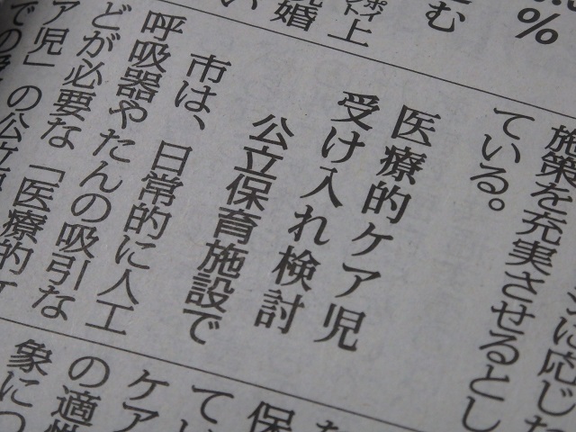 令和5年9月10日の福島民報新聞に、8日の福島市議会令和5年9月定例会議本会議の一般質問で質問した、医療的ケア児の保育に関する記事が掲載されました。医療的ケア児の公立保育施設での受け入れに向けて、検討が進められています。