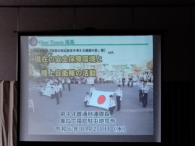 陸上自衛隊福島駐屯地にて、市民の安全・安心を考える議員の会の駐屯地司令講話を聞く会に参加しました。駐屯地司令の講話を伺い、市民の安全・安心についての理解を深めました。