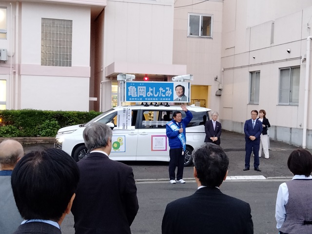 亀岡よしたみ衆議院議員候補の遊説に同行しました。沿道から、多くの皆様にご声援頂きました。誠にありがとうございます。街頭演説には、山本順三参議院議員や順天堂大学の天野篤特任教授にも応援に駆けつけて頂きました。