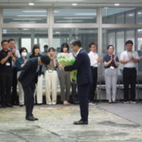 木幡浩市長が任期満了に伴い退任されました。中核市への移行や新型コロナウイルス感染症対策、そして業務改革等に尽力頂き、感謝の意を込めて花束が贈呈されました。