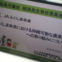 福島市議会経済民生常任委員会に出席しました。議題は、所管事務調査「持続可能な農業の振興に関する調査」の参考人招致とその意見開陳で、JAふくしま未来の佐久間英明代表理事専務から次の3項目を聴取しました。・持続可能な農業への …